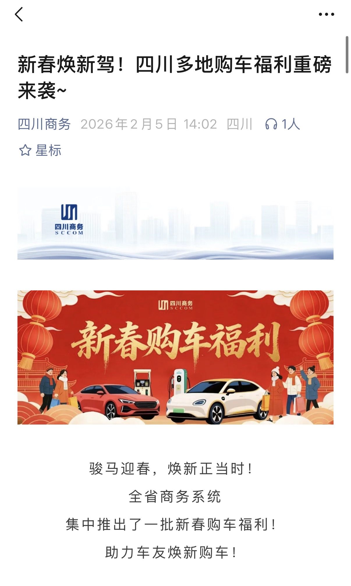 各地推出的补贴标准是多少?怎么申请补贴?想要购买新车的车友可在四川商务微信公众号搜索《新春焕新驾!四川多地购车福利重磅来袭~》一文进行查询。